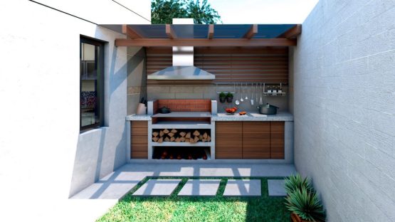 El área de BBQ comprende una pérgola de policarbonato para protección del sol y lluvia, ducto de ventilación, mesones de granito, parrilla y muebles bajos.