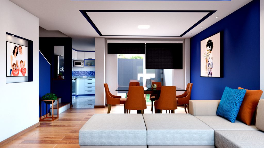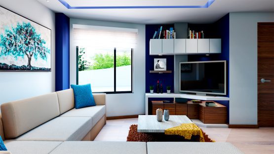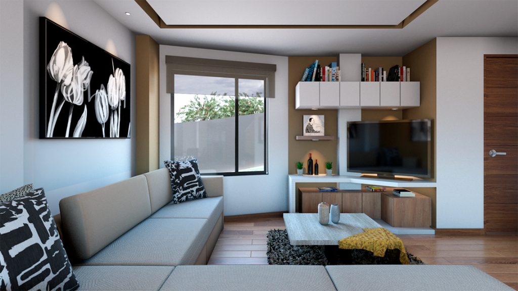 El lugar para compartir con los amigos y la familia con espacio para sofás en L, dotada de un mueble para televisión y biblioteca, elaborado en MDF y gypsum, con iluminación indirecta y con espacio adicional de almacenamiento.