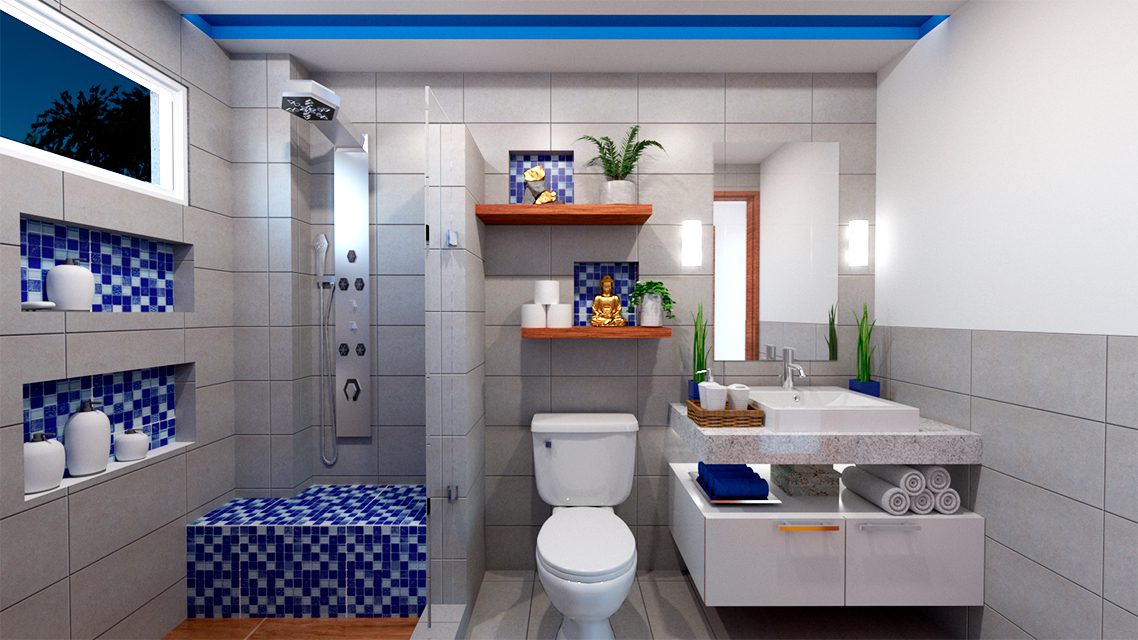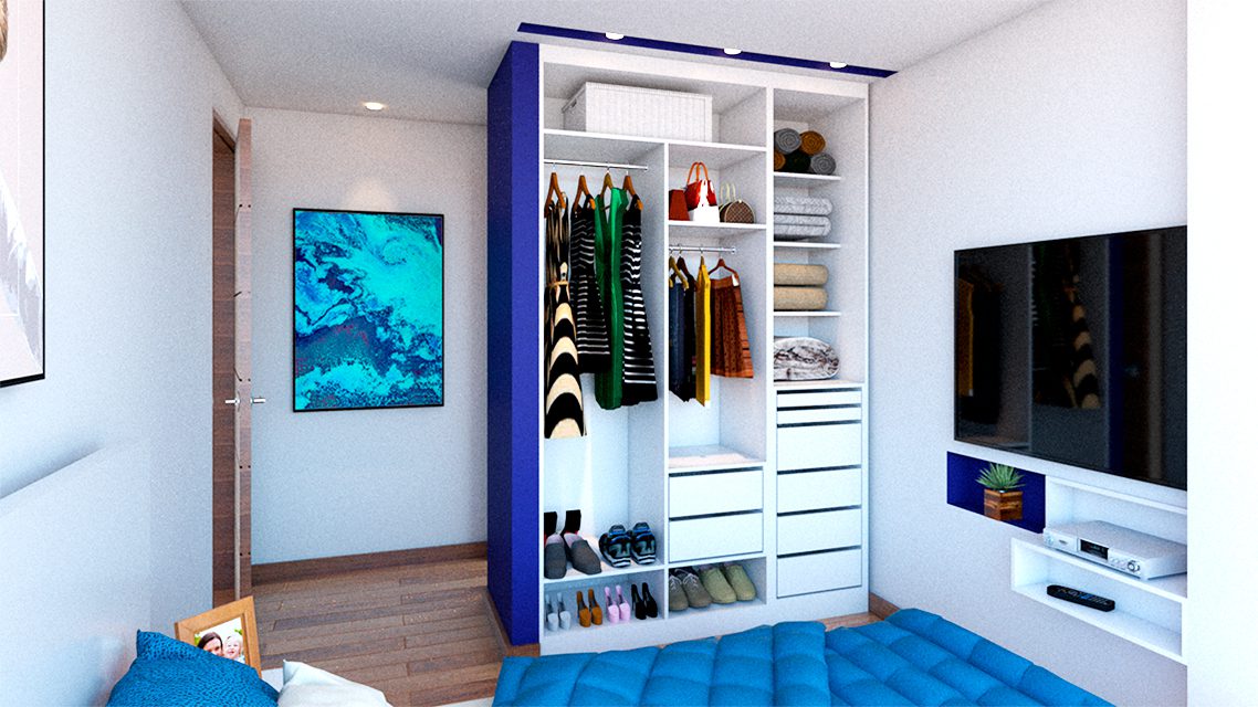 El lugar para compartir con los amigos y la familia con espacio para sofás en L, dotada de un mueble para televisión y biblioteca, elaborado en MDF y gypsum, con iluminación indirecta y con espacio adicional de almacenamiento.